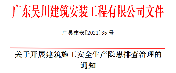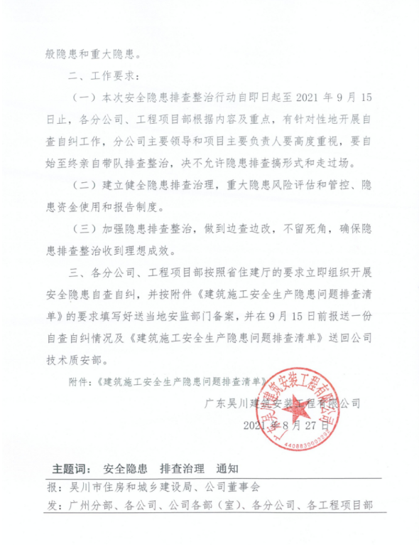 一、根據(jù)省、市住建主管部門關(guān)于全面開展建筑施工安全生產(chǎn)隱患排查治理的通知要求,公司董事會(huì)要求各分公司、工程項(xiàng)目部從即日起對(duì)在建工地開展建筑施工安全生產(chǎn)隱患排查治理行動(dòng)。